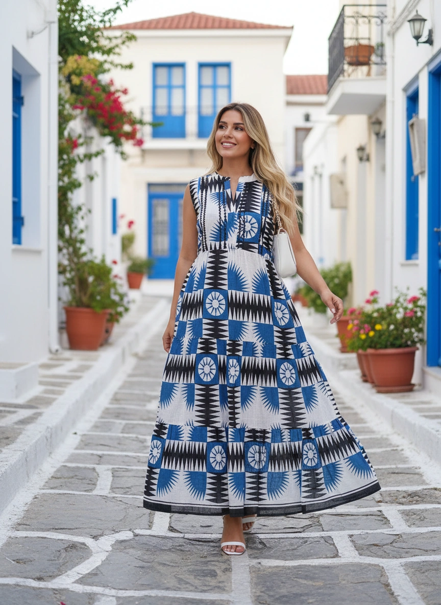 Φόρεμα εμπριμέ 100% βαμβακερό με χρώματα άσπρο, πετρόλ και μαύρο.