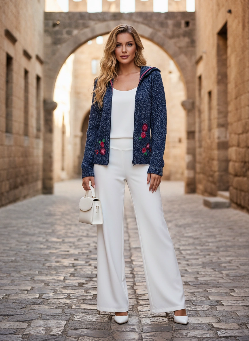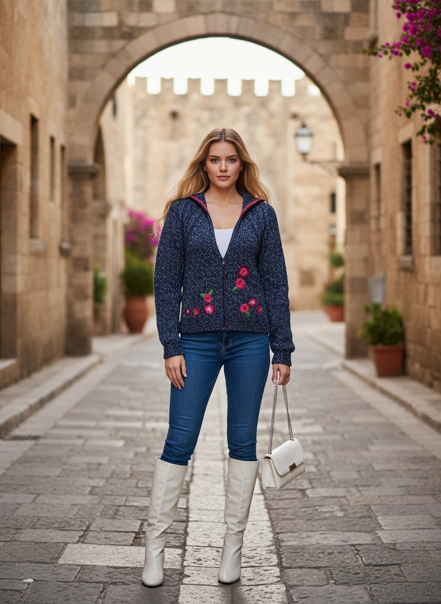 Πλεκτή Ζακέτα Μάλλινη Μπλε με Χειροποίητο Κέντημα Λουλουδάκια.