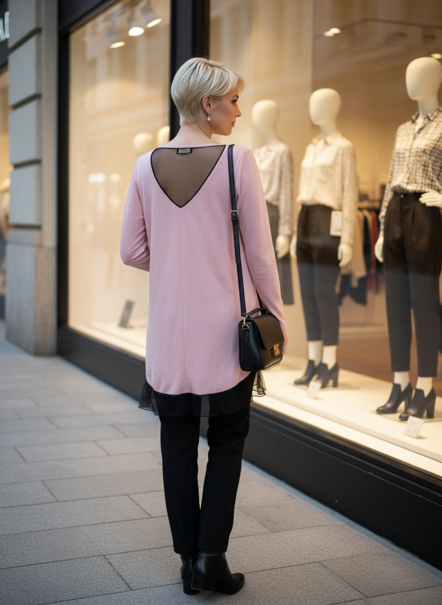 Μία όμορφη μπλούζα με λεπτομέρειες από μαύρο τούλι στο τελείωμα και στη πλάτη.