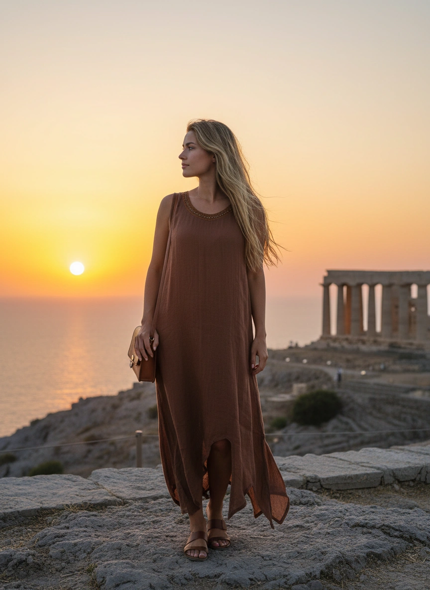Φόρεμα Καφέ Σοκολά Ασύμμετρο Γάζα Λινή.