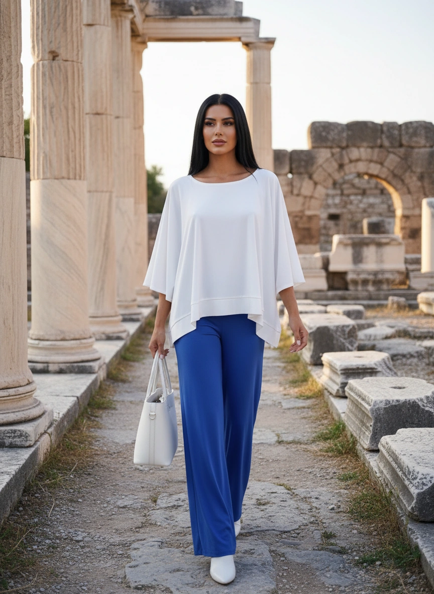 Μια πολύ ωραία μπλούζα φτιαγμένη από ύφασμα ελαστικό κρεπ σε άσπρο χρώμα.